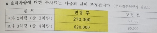 내용에 따르면 차량 3대를 보유한 입주민의 경우 기존 5만원에서 27만원을, 4대일 경우 8만원에서 62만원을 부담해야 한다. 기존 이용요금보다 4~7배 이상 높아졌다.